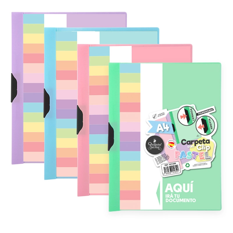 Dossier de color pastel en tamaño A4 con cierre de clip, perfectos para proteger todos tus documentos.