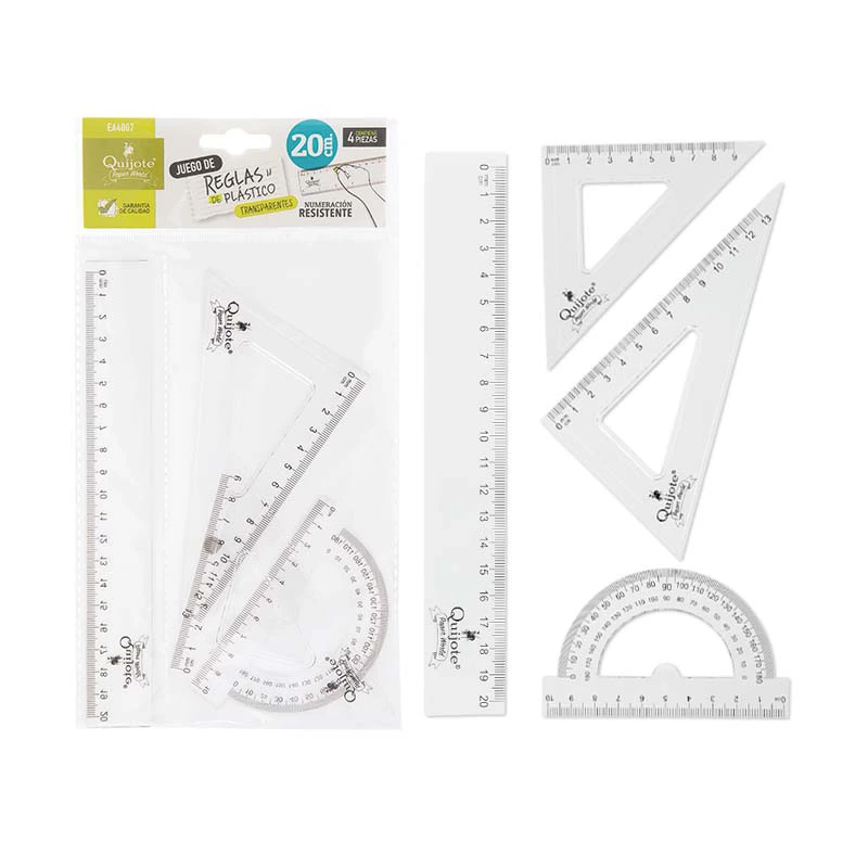 Incluye regla, escuadra, cartabón y transportador de ángulos.